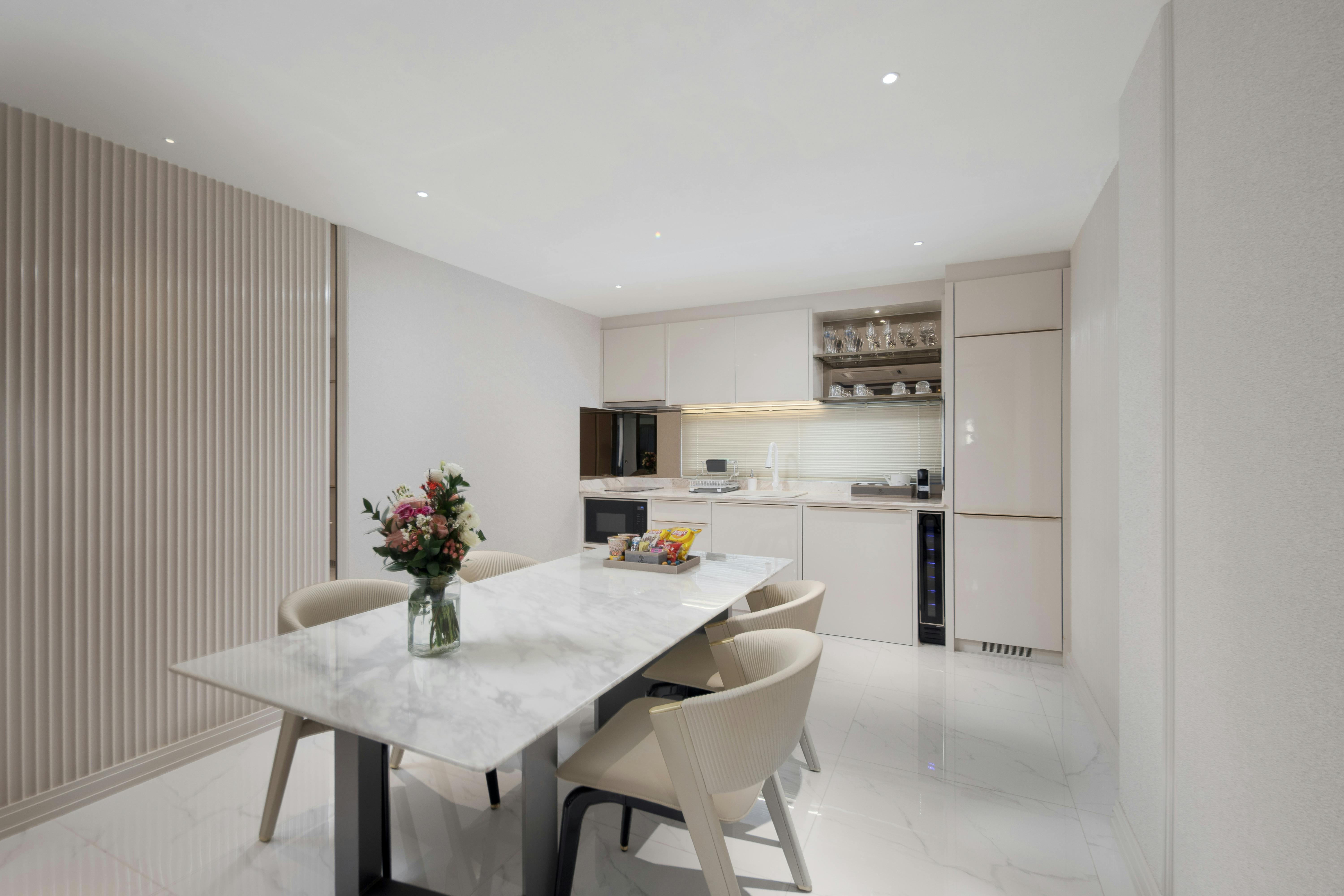 This spacious suite features a comfortable double bed and a fully equipped kitchen, perfect for convenient in-room dining. Ideal for extended stays, it offers guests extra comfort, privacy, and the freedom to feel right at home.